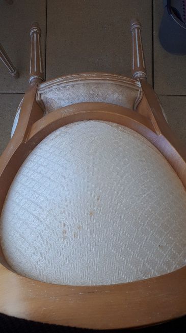 Coucou comme vous le voyer sur les photos ces chaises son tâcher. J'ai vue un pro qui ma dit que c'etais un traitement anti tâche qui ressort il y a rien à faire. Comment camoufler sa ?