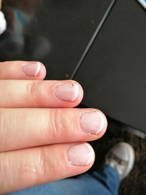 Une french avec vernis paillette nude et un petit strass... J'aime bcp mais les ongles ne sont pas assez long, l'esthéticienne m'as dit de faire une cure de durcisseur avant le mariage. Qu'en pensez vous ? Bon la. Photo ne rend pas bcp les...