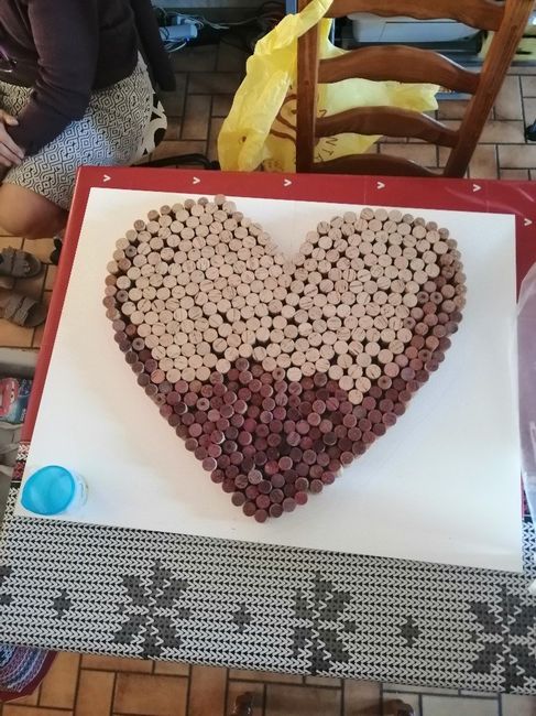 Hier après midi avec mon papa essais du cœur en bouchon de liège pour le plan de table.... Résultat pas mal je trouve mais pas assez de bouchons coloré rouge rosé donc on as comblé avec des neutre mais ce n'est pas ce que je veut tt à fait... Autre...