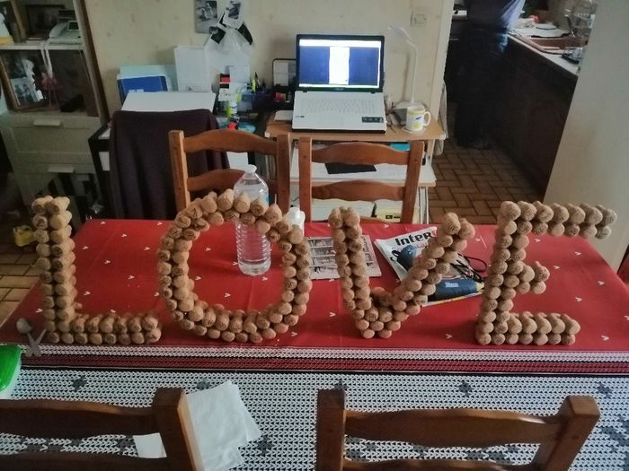 Salut les filles alors moi j'étais en vacances chezes parents où aura lieu le mariage donc DiY a fond !! J'ai ma témoins qui m'as recup des bouchons de champagne au travail de son mari. Du coup on as fait notre love pour mettre à l'entrée de la salle...