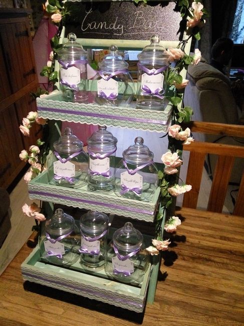Et voilà le travail, il n'y a plus qu'à le remplir ! Le petit Candy Bar pour 60 personnes thème lavande (je sais, la couronne ce sont des roses, mais pas moyen d'en trouver avec de la lavande, donc bon ^^"). Et merci à Stella, grâce à son post sur le...
