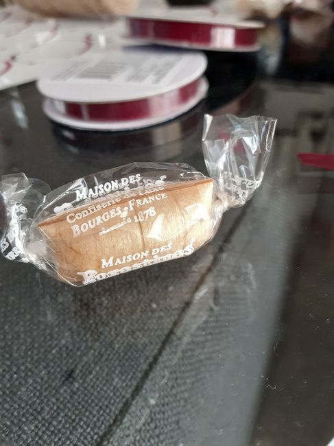 Coucou Voilà nous avons trouvé nous contenant pour les cadeaux des invités Cet après-midi c'est confection de petit nœud avec les rubans. Heureusement que j'ai des petits doigts, et quelques forestine pour le carburantBonne semaine à toutes les FM...
