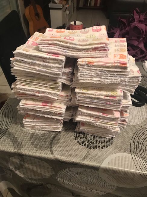 Coucou Ça avance petit à petit Hier coupe des 148 lingettes pour cadeau aux invités filles plus qu à les coudre et retourner 40 fleurs sur les 130 à faire on avance doucement 😊merci à ma maman