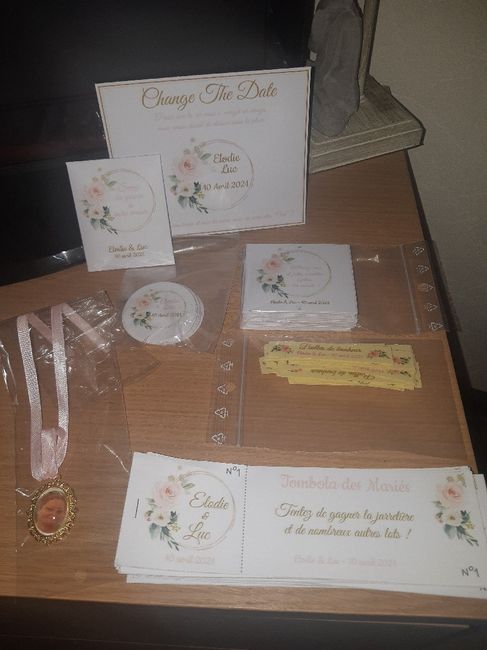 Bonjour a toutes ,je voulais partager avec vous mon colis du jour ! Les change the date et etiquettes dragées que nous avons refait . les tickets de tombola et les sachets de graines etaient commandés mais pas encore fait du coup on a de la chance...