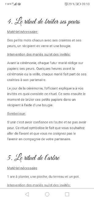 Bonjour, Je viens de parcourir le forum de mariage.net et ai appris beaucoup de nouveaux rituels. J'ai également été sur ce site internet qui recensent quantité d'informations : https://www.une-belle-ceremonie.fr/category/rituels-ceremonie-laique/...