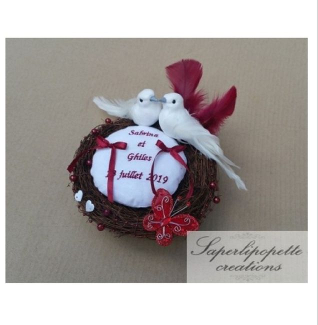 Coucou la commu, Je partage avec vous ce soir le super cadeau que me fait ma témoin. Coussin fait maison. Et vous votre porte alliance fait main ? Classique ou pas ?