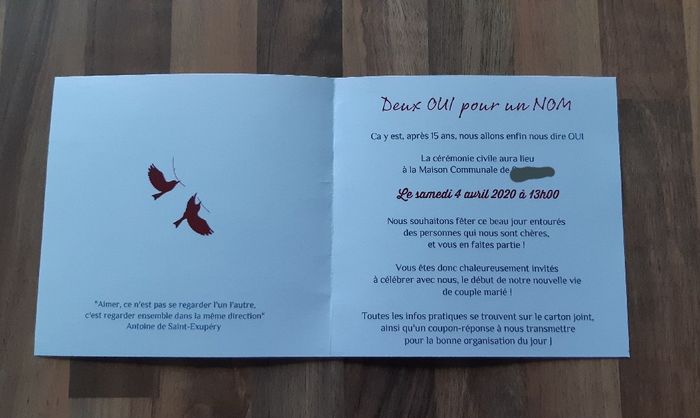 Bonjour les filles! Je viens de recevoir les faire part et super contente du résultat,par contre c'est moi qui n'a pas pensé que mon faire part ,peut faire croire aux invités qu'ils sont invités juste pour le vin d'honneur alors que non c'est pour...