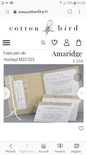Pour les faire part d'annonce aux gens qui ne sont pas invités, on a choisi un modèle sur le site faire part moins cher.com (photos 1 et 2) Pour les invités, on hésite à prendre le même (en changeant le texte bien sûr) et en rajoutant un carton à...