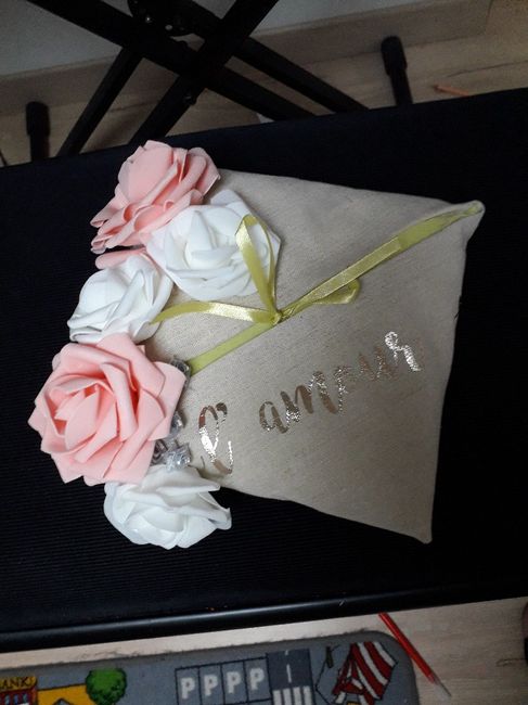 Coucou la commu, Je partage avec vous ce soir le super cadeau que me fait ma témoin. Coussin fait maison. Et vous votre porte alliance fait main ? Classique ou pas ?