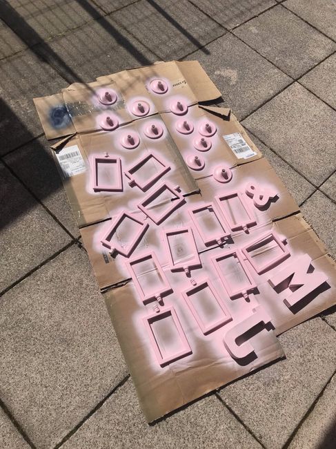 Coucou les filles, Quelques achats effectués aujourd'hui pour la décoration : des cadres TOLSBY IKEA pour les numéros de table à peindre et des grandes lettres à peindre également. J'ai pris des peinture en spray bleu et rose pour ça. Tout avance...