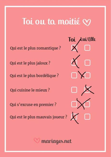 Hello tout le monde, J’ai beaucoup aimé vos réponse d’hier, et je me suis dit que j’allais recommencer un sondage 😇 ⚠️⚠️ HUMOUR ⚠️⚠️ Le jour de notre mariage nous sommes le centre d’attention de tous nos invités ! Et il faut faire une bonne...