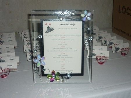 Voici ma présentation de menu pour mon mariage.Un par table.Il se pose verticalement.C'est un essai et ce n'est pas fini.Il me reste à apposer une fleur (le nom de mes tables sont des fleurs)par menu qui rappelle le nom de la table.Les cadres sont...