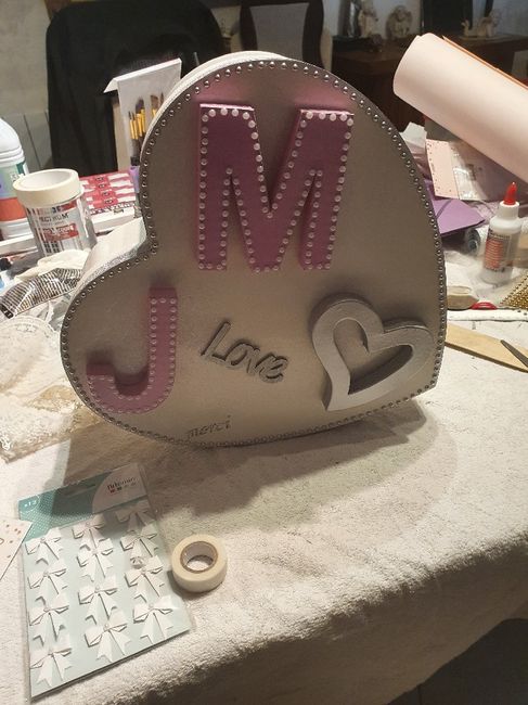 Cc les brides. Malgré les peur liées au coronavirus je ne veux pas céder à la panique et donc je continue de préparer ma déco...voici quelques photos... Boite pour coeur a signer.... Coeur pour nœud de voiture.... 1ère couche pour urne à décorer......