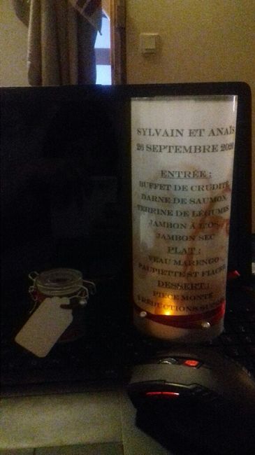 En avant pour les essais : Voici un test pour mes centre de table. Je mettrai des fleurs fraîches le jour J mais la j’ai pris ce que j’avais sous la main. Je rajouterai un numéro en bois et je collerai l’étiquette du menu sur la bouteille...
