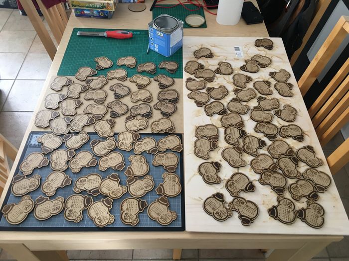 Bonjour! Voici quelques photos de nos avancées pour le mariage. Nous gravons des dés pour faire un jeu sur la mécanique du Yahtzee où il faut faire des paires, brelans, full ou des suites mais avec des symboles nous correspondants. Et en cadeau pour...
