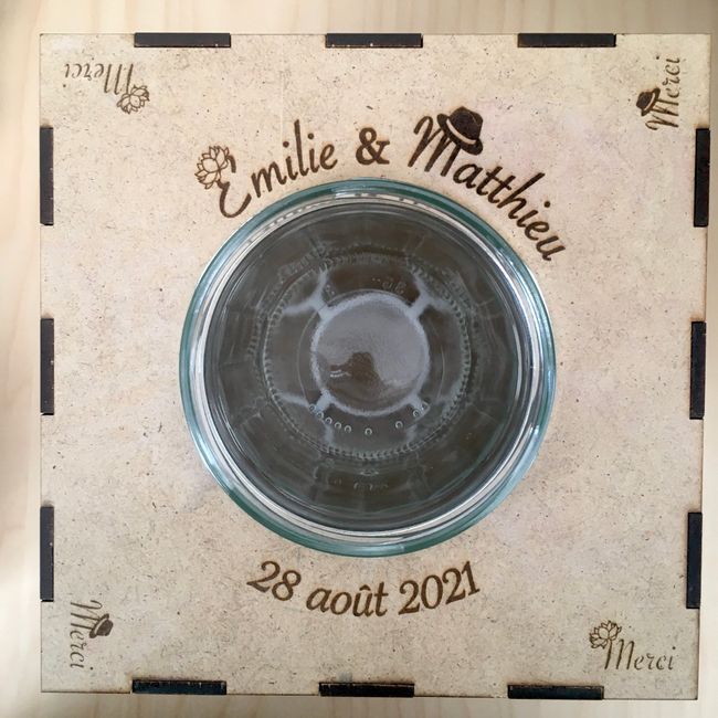 Et voilà la gravure qui ira sur le dessus de notre dé « centre de table » Le pot de confiture accueillera le bouquet !