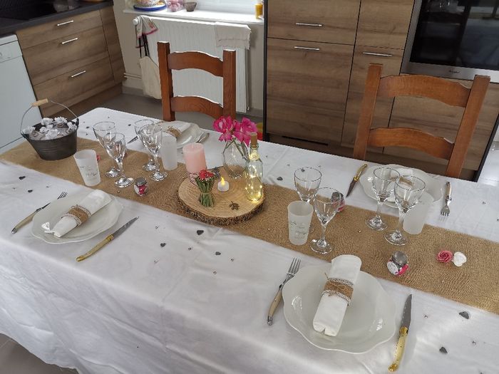 Coucou les FM, Je vous présente mon essai de table, qu'en pensez vous ? À savoir que ce sera des tables rondes et des bouquets de fleurs uniques dans le vase