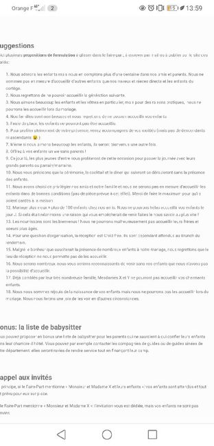 Bonjour, Je me marie le 22 mai prochain et j’aimerais vos avis concernant le point suivant; Les enfants à notre mariage sont les bienvenues pour la cérémonie et le VH en revanche nous ne souhaitons pas d’enfant (mis à part le notre, nos 2 neveux et 2...