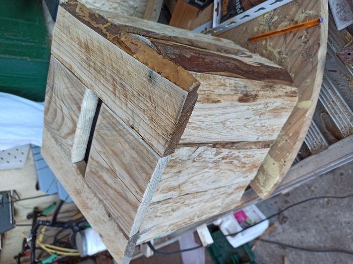 Plutôt très très fièr de nous et du travail accompli pour cette pièce de déco 🙂 Voici les étapes : Planche pourrie, pas droite , avec un thermocollant de vieille cuisine collé dessus. J'ai tout décapé, poncé, coupé droit et parallèle puis lazuré....