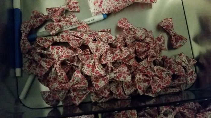 Bonjour à toutes et à tous ce soir j'ai fini mes noeuds pour mes faire parts !! 144 noeuds liberty !! Maintenant deuxième objectif de la semaine finir mes guirlandes de fanions !! Je vous laisse une photo de ma dernière fournée de noeuds