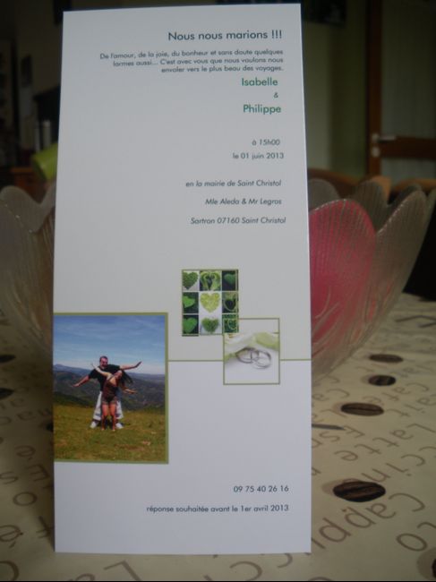 Salut à tous!! Par curisosité je me dermandais quel faire part avez vous choisi (photo)??? et quand on dit vos invités pour ceux et celles qui les ont déjà envoyés? Nous avons repéré un modele qui nous plait, simple et moderne...