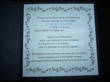 Salut à tous!! Par curisosité je me dermandais quel faire part avez vous choisi (photo)??? et quand on dit vos invités pour ceux et celles qui les ont déjà envoyés? Nous avons repéré un modele qui nous plait, simple et moderne...