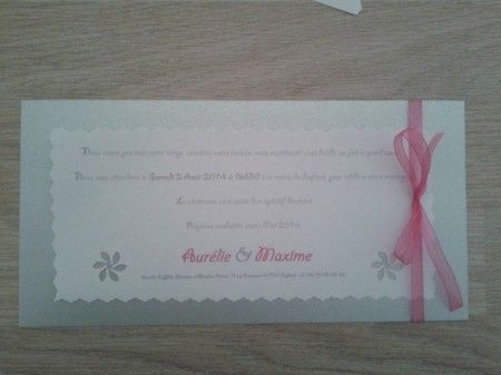 Salut les filles, voila je tiens à vous montrer mon 1er faire-part maison tout frais de 5 minutes. La cartonette de fond est argentée, le texte fushia en accord avec les couleurs de mon mariage. J'attends vos avis bon ou mauvais, la critique est...