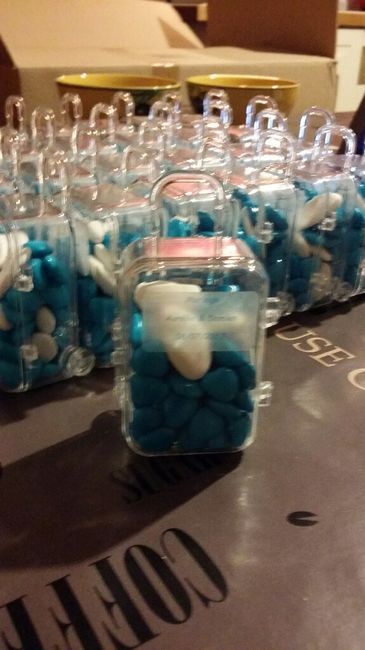 Nous avons acheté de super contenants à dragées. Et il y avait écrit que cela pouvait contenir 5 dragées amandes et 5 chocolats. Un dragée chocolat est équivaut à 20 petits coeurs chocolat. Bref j'avais tout calculé sauf le contenant plus grand que...
