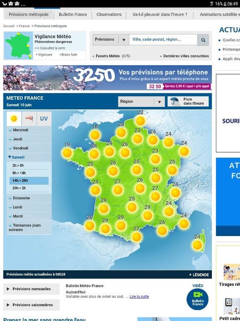 Coucou les beautés, Pour les mariées de ce samedi 10 juin, regardez moi ce merveilleux temps. J'espère qu'il n'y aura pas de changement. Je ne regarde jamais la météo mais là, mon jour approchant aussi (le 7 juillet), je regarde, j'avoue. Allez...