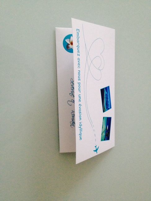 Faire parts envoyés ! Format pochette et billet d'avion dans l'esprit évasion idyllique thème de notre mariage aux couleurs turquoise et blanc