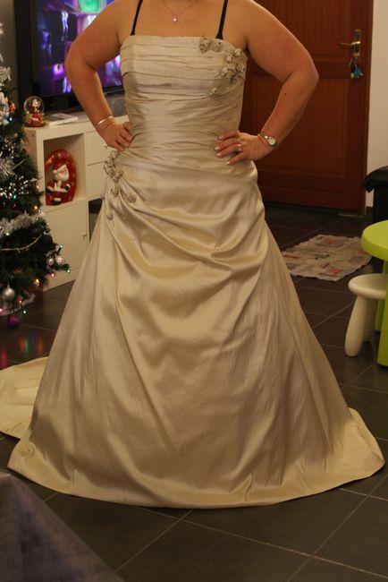 Robe de mariée avec étole couleur capucino taille 46 , petite roses en relief avec perles transparentes traine , drapé devant et dans le dos , fermeture par glissière Prix de vente : 300 euros Prix neuf avec étole : 1100 ...