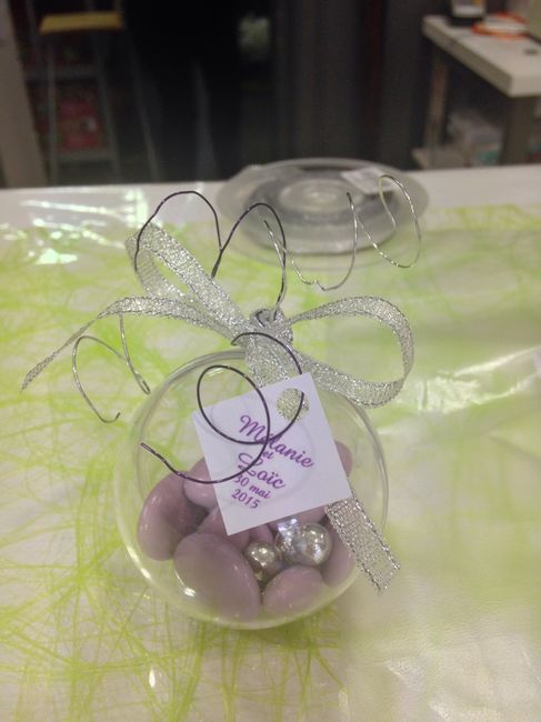 Dragées commandés on est super content ils seront suspendu par des rubans à un support grand vase transparent décorer avec des pierres et des fausses fleurs et branches des couleurs du mariage, on se rapproche du but