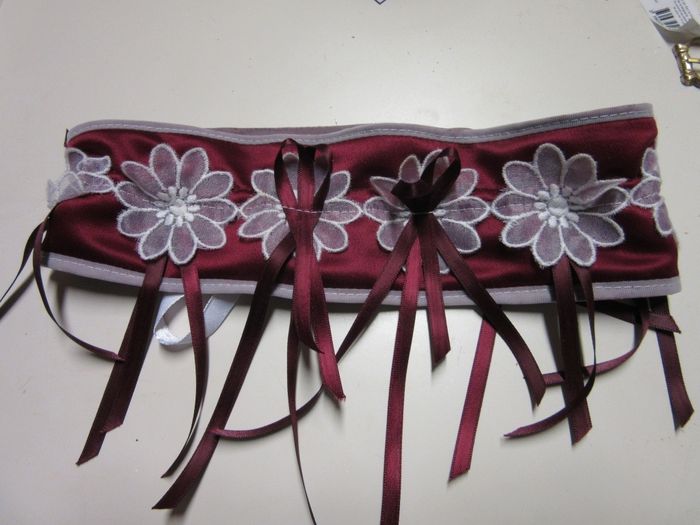 J'ai reçu la photo de la jarretière faite par ma couturière. Perso j'adore!!! Je lui ai laissé carte blanche, et comme elle a fait ma robe, elle avait le tissu et les couleurs. Du coup elle m'a fait quelque chose d'original, unique, et qui va bien...