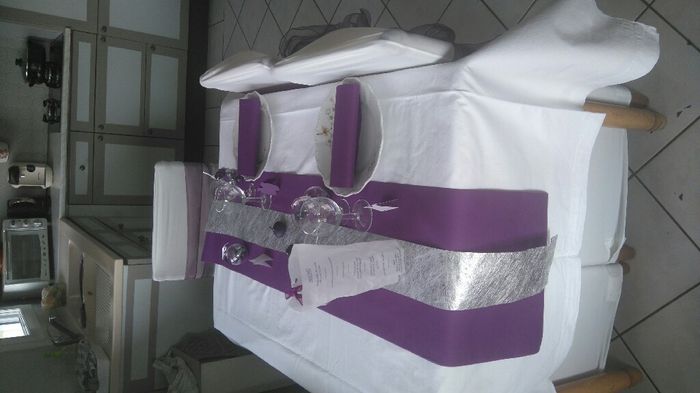J ai fait un petit tste table manque l essentiel les centre de table vase rond plat sable eau bougie violette et fleur blanche et les violette dans lez menus photophore qu en dites vous ???Hâte de voir avec to ut