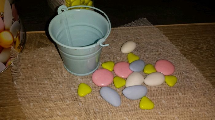 Voici mes dragées ! Ils seront dans ces petits pots avec ce petit tissu... Manque la petite etiquette et le ruban !! Petit conseil :selon vous que prendriez vous comme ruban ? Merci à vous !