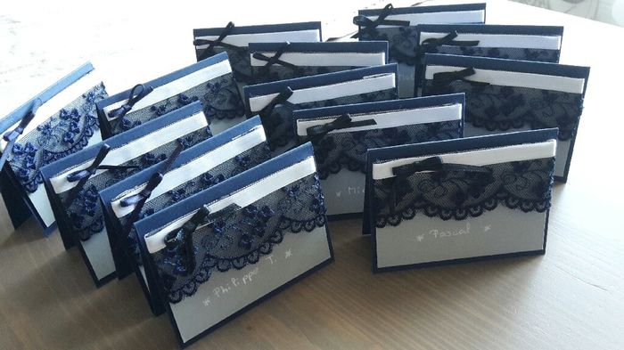 Voilà mes créations pour les portes noms de nos invités La dentelle blanche pour les femmes et la bleue pour les hommes.Vous en pensez quoi ?!