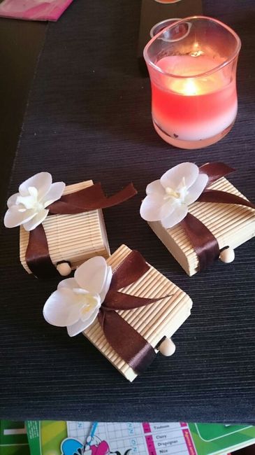 Encore un peu de faits mains. Il ne reste plus qu'à accrocher l'étiquette avec nos noms et la date aux flots et on aura nos jolies dragées. Les femmes auront celles la et les hommes auront les boites chocolat avec un flot ivoire. Notre thème est...