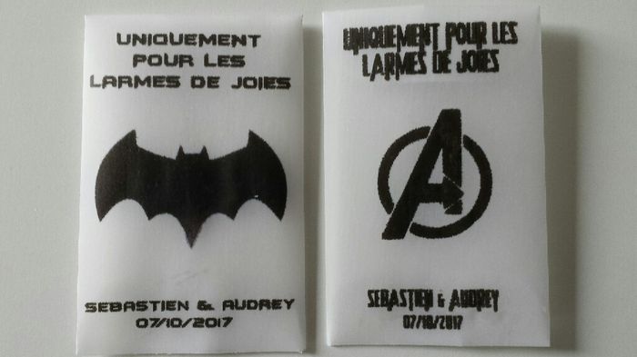 Aujourd'hui 1er essai pour voir le rendu de mes éventuels pochette larmes de joies. L'encre à bavé un peu. Je suis en train de faire ma sélection de police de super hero Notre theme de mariage C est les super heros