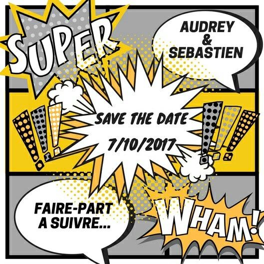 Et voilà on va officialiser !Thème du mariage comics -super hérosCouleurs dominante gris jauneOn enclenché le compteur , moins d un aie aie aie.
