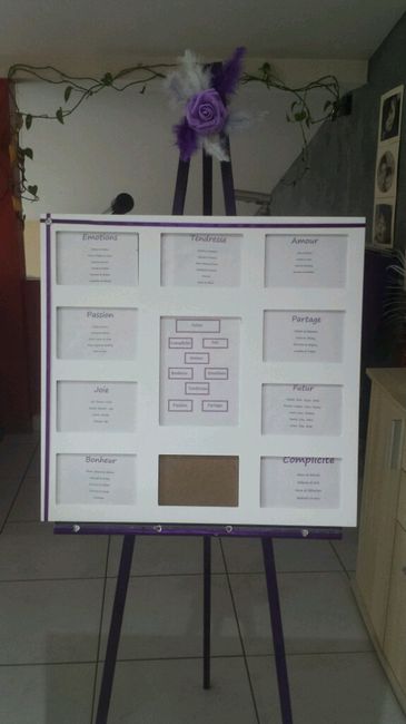 Moi j'ai voulu faire simple, (surtout le cadre je l' ai acheté tel quel sur le bon coin) : ) c'est dans mon thème ; blé, lavande champêtre j'ai juste eu à ajouter les pinces à linge en forme de coeur en ardoise. J'écrirai le nom de chaque table et je...