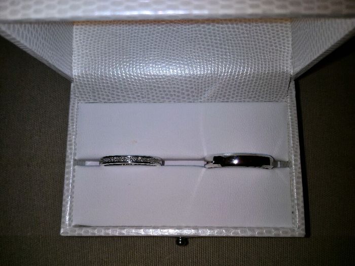 Ca y est après avoir été au salon du mariage d'Orléans nous avons enfin nos alliances à la maison ! C'est dur de ne pas la mettre je suis tentée mais je résiste ! Voici le style de nos alliances, la mienne est en or blanc & diamant, et mon chéri...