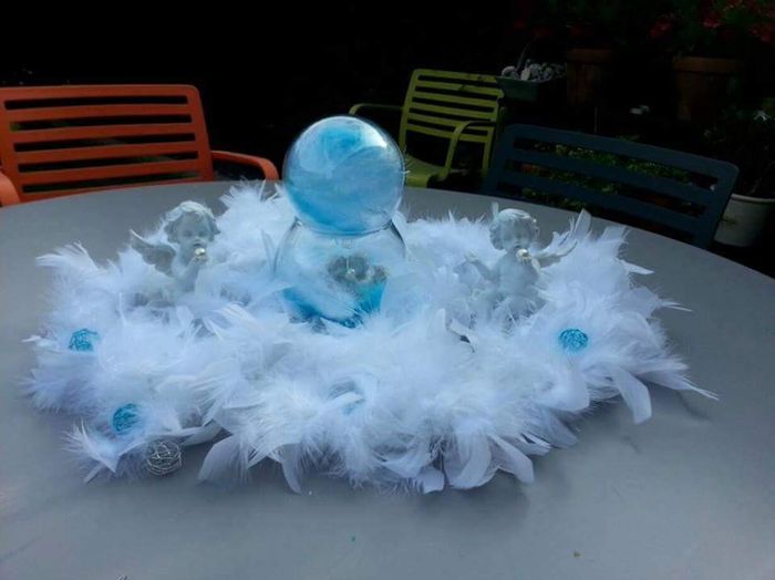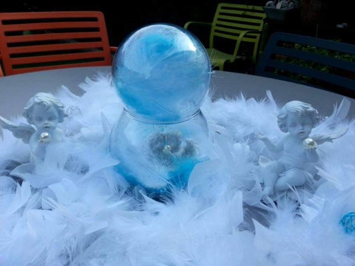 Bonjour les mariées (és) ! Que pensez-vous de mon centre de table ? Notre thème : angle bulle plume avec pour couleur bleu (notre couleur préférés) gris et blanc