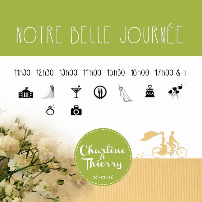Allez, à mon tour : La date de mariage : Samedi 16 juillet 2016 dès 11h30 Le nom de votre moitié : Thierry 27 ans. Le lieu de réception : Mairie à Laval (Isère, 800m d'altitude) suivi d'une cérémonie laïque sur le terrain de la maison de belle...