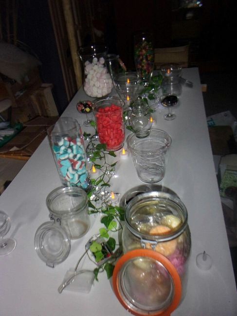 Hola les gens Ce week j'ai commencé à mettre en place ma deco des tables servant pour autre chose que manger je commence par le candy bar ou j ai mis certains bobon pour me faire une idée de la quantité les bonbonnière vide seront rempli évidemment a...
