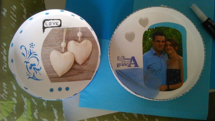 Et voila ayant du temps en ce moment je me lance dans mes premières petites créations. Des petits "cadres" en boite à camembert qui serviront à décorer notre grillage le jour de notre fête de fiançaille le 4 juin dans notre jardin ( un an pile poil...