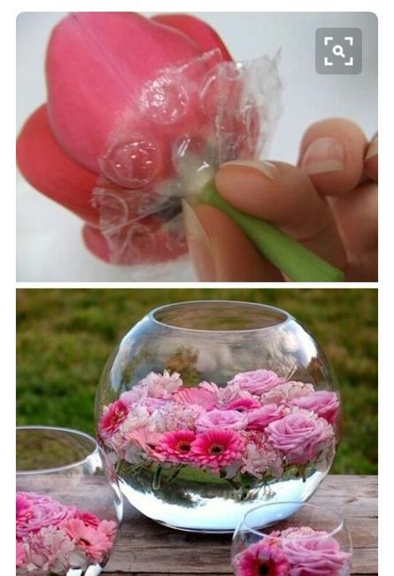 Coucou Je partage avec vous la petite astuce trouvé sur le net pour faire flotter les fleurs. Rien de plus simple, on utilise simplement du papier bulles sous les fleurs.