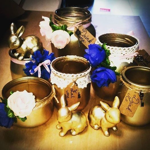 J'ai récupéré les pot de yaourt en verre ainsi que des pots de confiture et autres ! J'ai acheté des petites fournitures sur Alicexpress et de la bombe de peinture Or chez Action ! Et voici le résultat ! Toujours dans mon thème Alice in wonderland !...