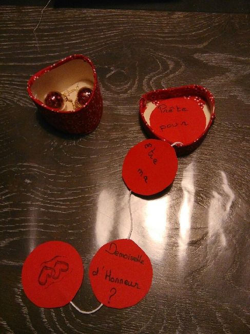 Bonjour à tous voici mon idee pour ma demande a ma temoin ... Je deposerai cette boite dans un coffret remplie de petit cadeaux : parfum vernis bijou .... Et vous qu'avez vous fait ..?