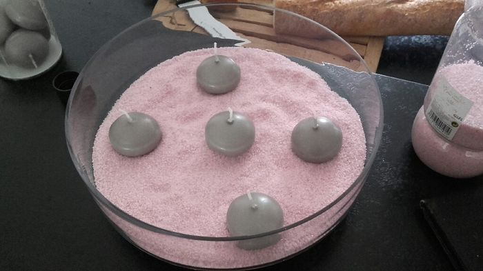 Coucou tout le monde.Voilà je commence à chercher des idées pour le centre de table mais je suis pas trop inspirée .J'ai pensé à ça qu'en pensez vous? Les couleurs sont rose clair / vieux rose et gris et pas vraiment de thème juste ambiance...