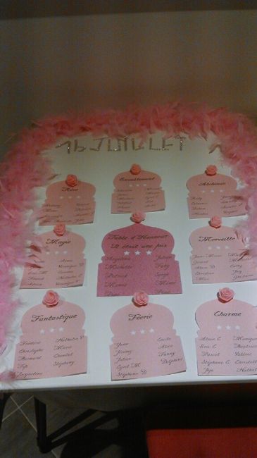 Il y a 3592 joursCoucou les filles besoin de vos avis sur mon plan de table voir ce que vous en pensez il s agit d une ébauche les feuilles ne sont pas encore collées et en haut 16 juillet sera bieneécrit avec les bons strass avec en dessous 2016 et nos initiales le...